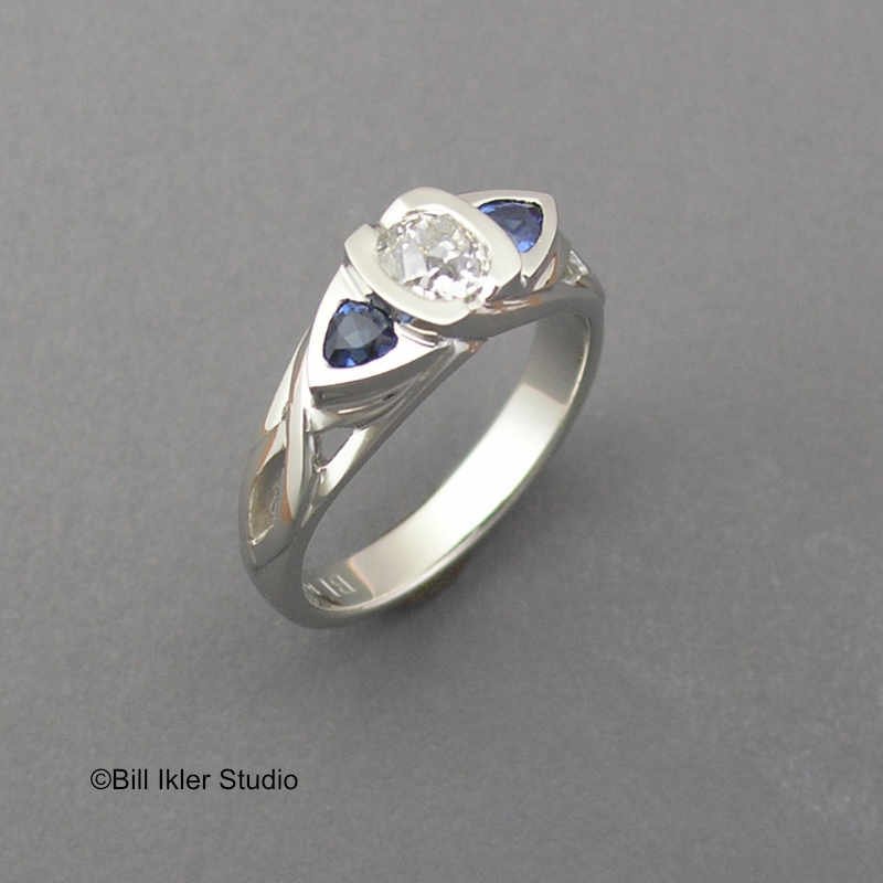 Lace Trillion Ring, shown in 14k white gold with oval diamond and blue sapphire trillion side stones.